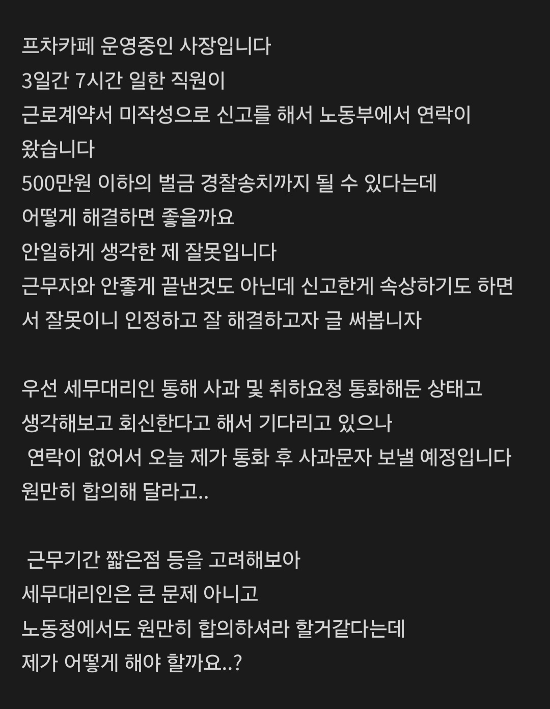 3일간 하루 7시간씩 일한 직원이 근로계약서 미작성을 이유로 노동청에 신고했고,